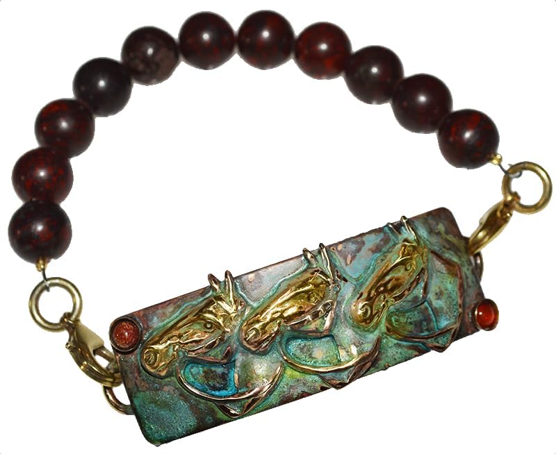 Elaine Coyne Collectible Artwear Unisex Equestrian Curved Verdigris Patina Rectangle Tri Horse Head Rockband - Jasper Beads