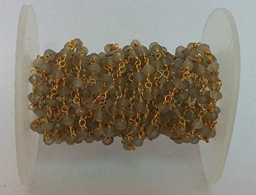 3 feet gray moonstone beaded chain - gold over sterling silver wire or gold plated wire wrapped chain - rosary beaded chain 3-4mm